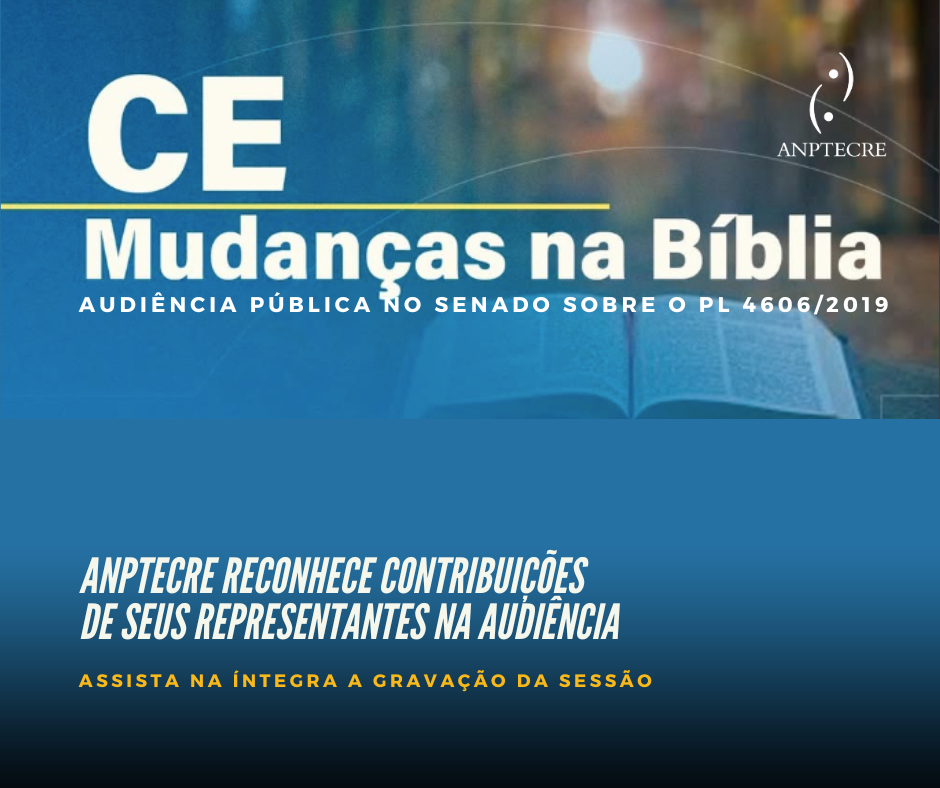 A ANPTECRE parabeniza as contribuições apresentadas por seus representantes na audiência pública do Senado Federal sobre o PL 4606/2019, que busca proibir alterações nos textos da Bíblia Sagrada. As intervenções reafirmaram a importância da liberdade religiosa, da liberdade de cátedra e do compromisso acadêmico com o pluralismo interpretativo e o debate público qualificado.
