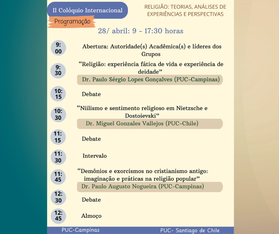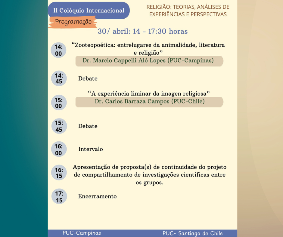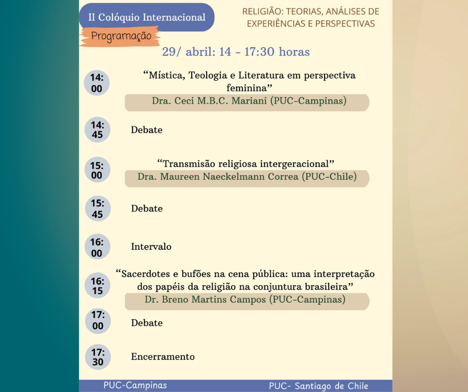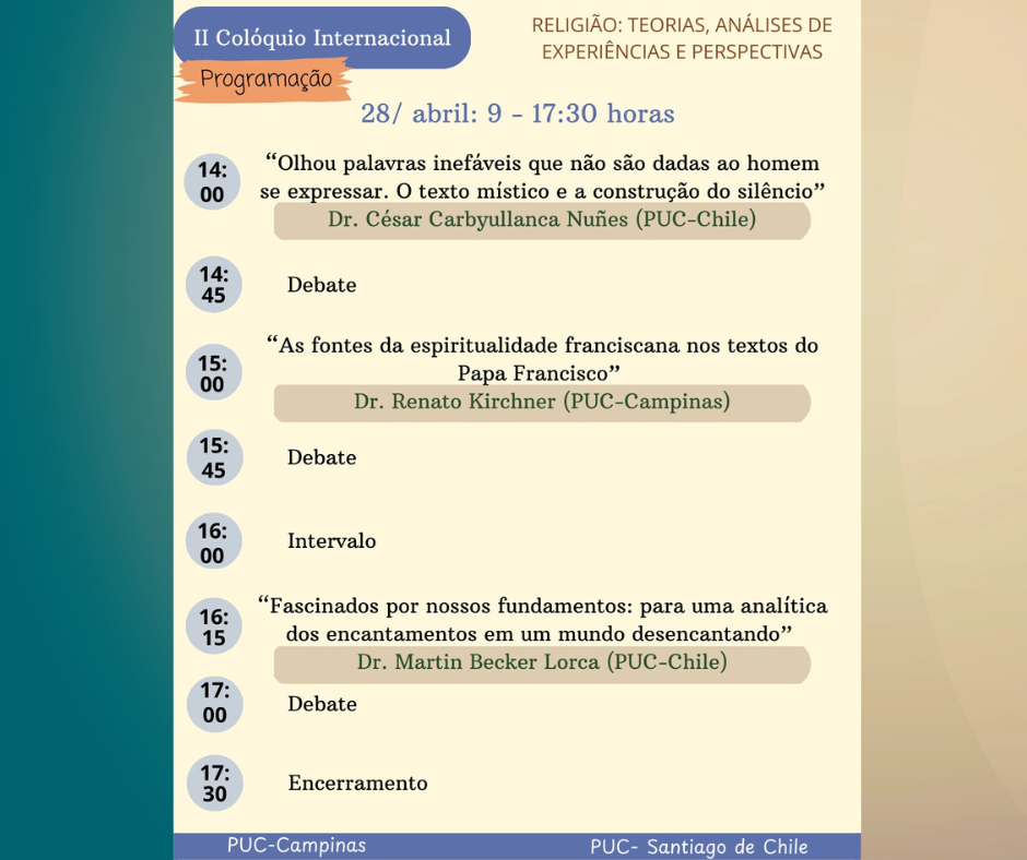 Nos dias 28, 29 e 30 de abril, a PUC-Campinas realizará, no Espaço Manacás do Campus 1, a segunda edição do Colóquio Internacional Religião: teorias, análises de experiências e perspectivas. O evento reunirá pesquisadores do Programa de Pós-Graduação em Ciências da Religião da PUC-Campinas (PPG-CR) e do Centro de Estudios de Religión (CERUC), da Universidad Católica de Chile.